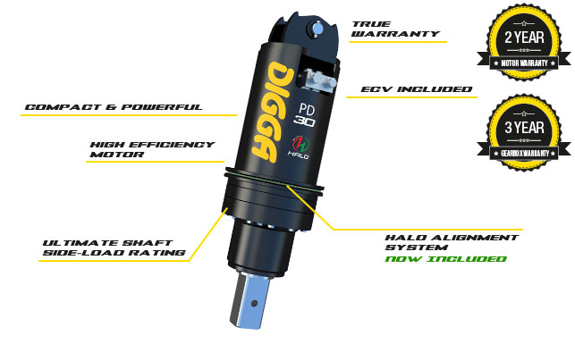 Now included in all PD25-50 Anchor Drives, the new innovative Halo alignment system ensures holes are drilled plumb and reduces the need for in-hole angle adjustments. The highly visible LED indicator wraps around the Anchor drive and will shine green when straight, allowing you to never take your eyes off the job to realign your auger.